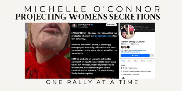 Michelle is a vocalist for a local Seattle band named, iPanda Conspiracy Michelle O'Connor approached me within just a couple minutes of Devin Hermanson grabbing me. Michelle O'Connor yelled at me to take off my mask. She then proceeded to spit in my face while her friends assaulted me from multiple angles-- including while a woman named Anastasia Fedorova (a local Russian Photographer) was trying to pull my head dress and mask off from behind, while Zoe Mason was standing in front of me and hitting me with her sign while having a complete emotional breakdown and calling me a fat cunt as if her words were supposed to hurt me as my presence alone was mentally eating them alive. Michelle O'Connor seized this time to try to spit on me. Michelle is facing potential criminal charges and civil lawsuits.