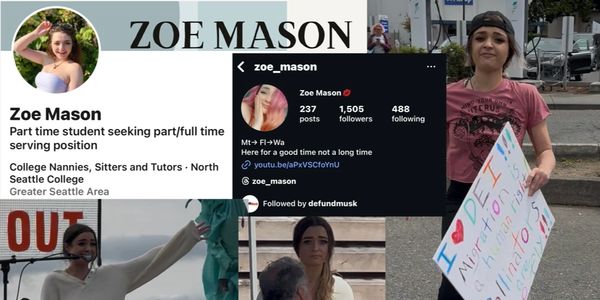 Zoe Mason is a local leader in the Seattle Indivisible and Defund Musk groups. She also markets herself as a nanny. (Yikes! Hide yo kids.) Zoe Mason initiated the mob attack against on me on 7.26.25. Zoe Mason approached me while I was peacefully walking down the side walk in a public space. She asked me to remove a mask I was wearing and I politely told her no and walked away from her. She then proceeded to follow me, steal a sign from another protestor and began to start hitting me with the sign and trying to block my camera. Zoe Mason quickly lost all control of her emotions and proceeded to run around yelling at me. At one point she began to cry to fellow protestors, because she wasn't able to control my movement and actions like the tyrant she wishes to be. Zoe Mason is facing potential criminal charges and civil lawsuits.