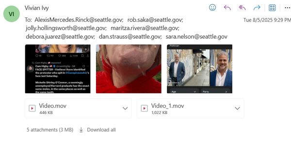 I have contacted every Seattle City Council Member with my video evidence and story. Member Rinck was a key speaker at the rally that I was assaulted at on 7.26.25. I believe the entire City Council needs to be aware of the violence that takes place against women at these rallies they speak at.